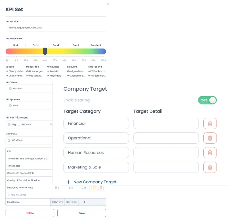 Memungkinkan HR dan manajer untuk menentukan KPI Karyawan yang spesifik dengan tujuan perusahaan.